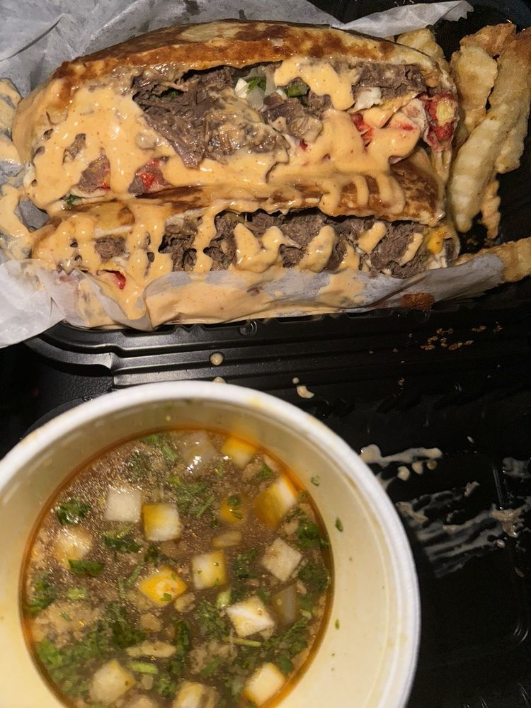 Mozzarella cheese, nacho cheese shredded steak beef, onion, parsley, Doritos turbo sauce.