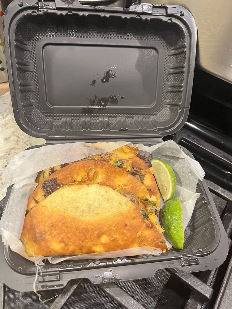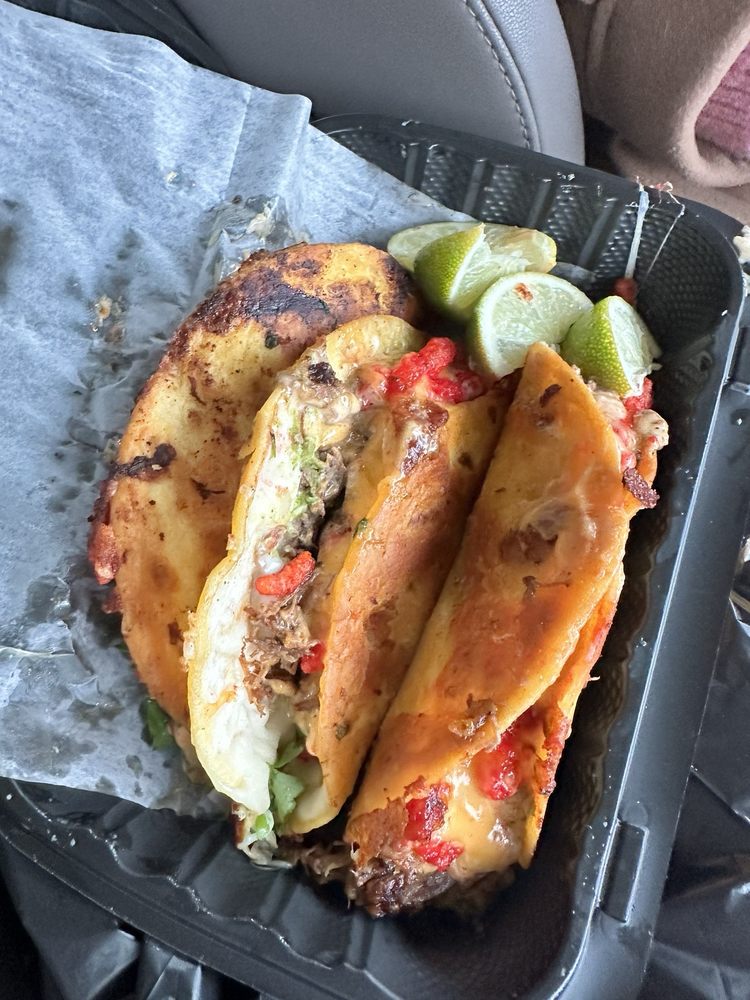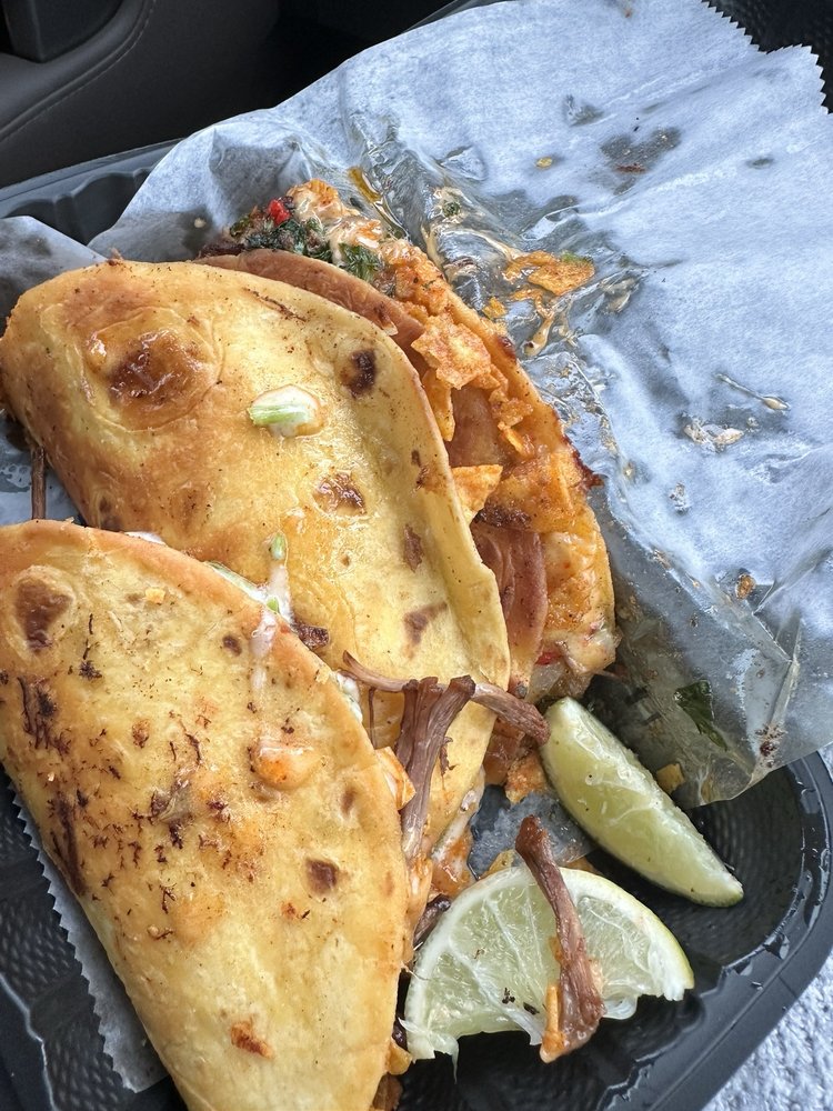 1 taco only. Beef onions, cilantro, spot sauce and Doritos.