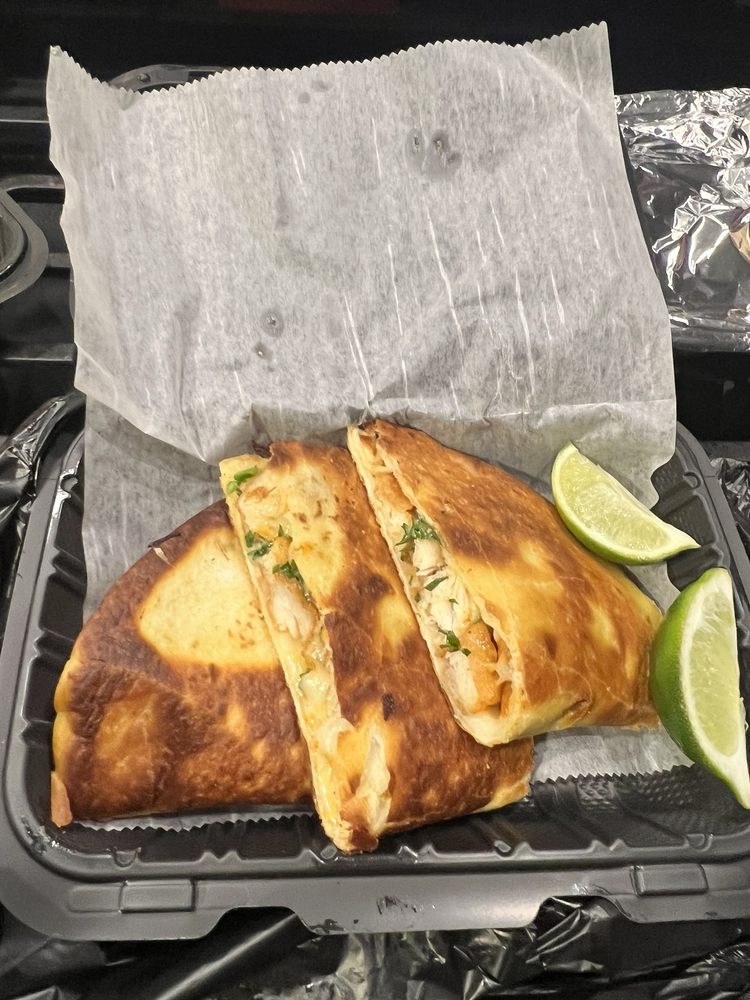 Mozzarella cheese, shrimp, onions, cilantro, chopped coslaw , turbo sauce.